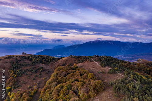 © константин константи, Fototapeta premium panoramic view of yellow autumn mountains against a background of blue haze and storm clouds filmed from a drone