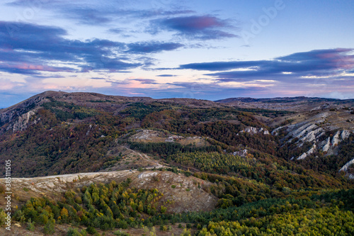 © константин константи, Fototapeta premium panoramic view of yellow autumn mountains against a background of blue haze and storm clouds filmed from a drone