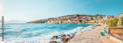 Fototapeta premium Panoramic view on a beach of a small beautiful town Postira - Croatia, island...