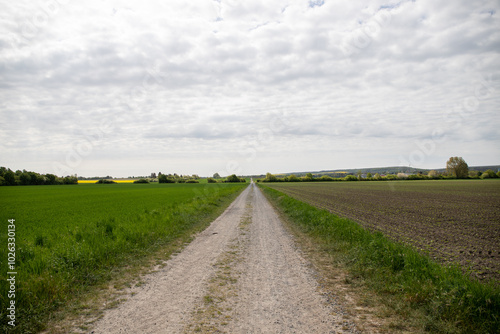 Naklejka premium Panoramic view on a dirt road in September with corn, rapeseed, sugar beet...