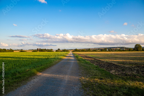 Naklejka premium Panoramic view on a dirt road in September with corn, rapeseed, sugar beet...