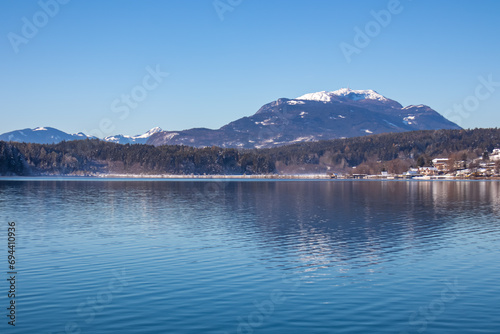 © Chris, Naklejka premium Panoramic view on lake Faakersee in Austrian Alps, Carinthia, Austria. Lake is surrounded by high snow capped mountains. Calm water surface with reflections of landscape. Looking at Dobratsch peak