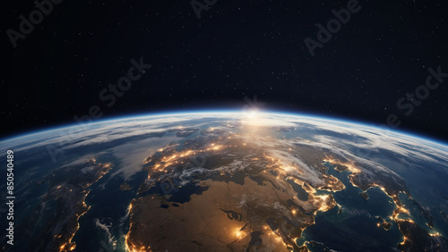Obraz premium Panoramic view on planet Earth globe from space with rising sun glowing city...