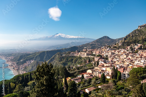 Fototapeta premium Panoramic view on snow capped Mount Etna volcano and Mediterranean coastline on sunny day seen from coastal hilltop town Taormina, island Sicily, Italy, Europe, EU. Vacation tourism travel destination