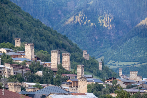© Chris, Obraz premium Panoramic view on the Svan towers in Mestia, a highland townlet, located in the High Caucasus, Svaneti Region in Georgia.The Svan watch towers have a unique defensive architectural structure. Rural