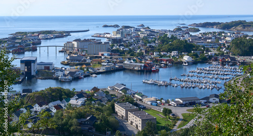 Obraz premium Panoramic view on town Svolvaer seen from trail to mount Floya, along the...