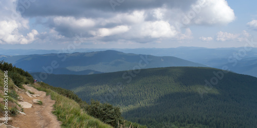 © Vitali, Naklejka premium Panoramic view on way to Hoverla, Carpathian mountains, Ukraine. Horizontal outdoors shot