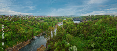 © vdovychenkodenys, Obraz premium Panoramic view over a landscape of river and forest