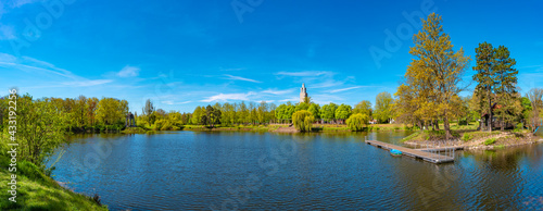 Fototapeta premium Panoramic view over city park and lake in Spring colors at sunny day with...