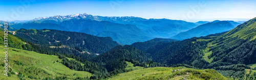 © Dmitrii Potashkin, Obraz premium Panoramic view over the Green Valley, surrounded by high mountains with snow on a clear summer day.