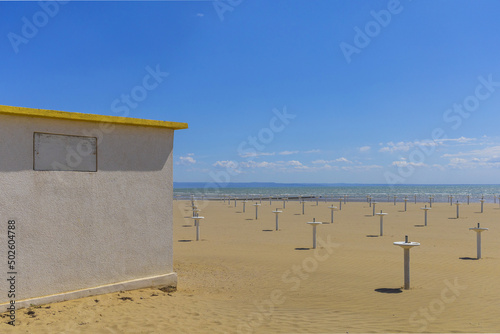 Obraz premium Panoramic view to Grado Adriatic sea beach with tiny white building under blue sky on sunny spring day