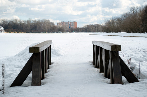 Naklejka premium Panoramic views of the frozen lake, forest and houses. Wooden bridge over the stream