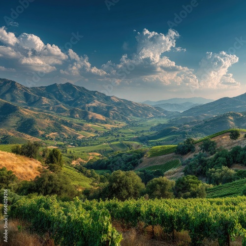 © Faki, Naklejka premium Panoramic vineyard valley scene. Sunlight bathes rolling hills