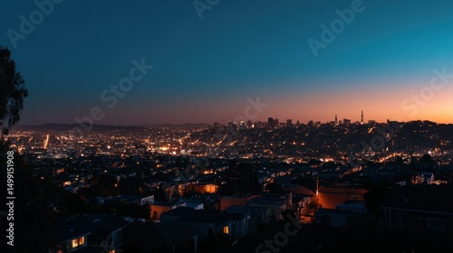 © jiray, Obraz premium Panoramic vista of a sprawling city illuminated against a twilight gradient sky
