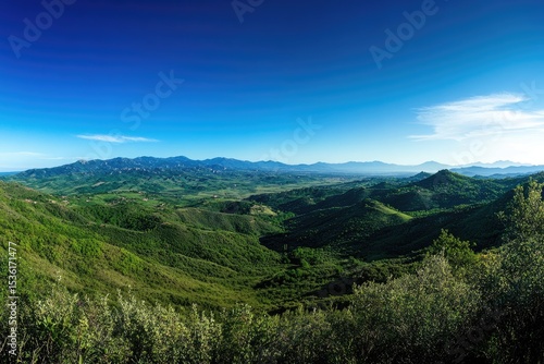© 9, Obraz premium Panoramic vista of rolling hills and valleys under a vibrant blue sky