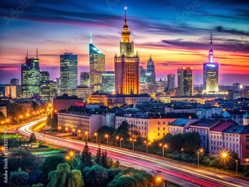 Obraz premium Panoramic Warsaw Cityscape at Night - Long Exposure Photography