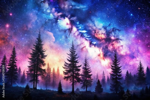 © Four888, Naklejka premium Panoramic Watercolor Silhouette of Pine Trees Against a Cosmic Nebula Sky