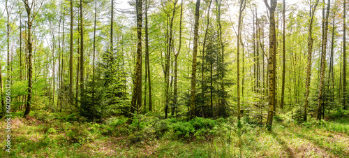 Fototapeta premium Panoramic with magical enchanted fairytale forest with fern, moss, lichen and...