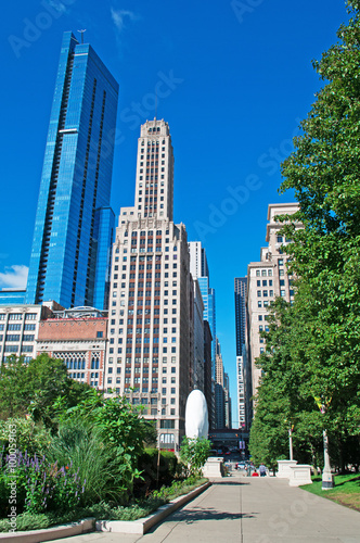 © Naeblys, Obraz premium Panoramica di Chicago, skyline, grattacieli, Millennium park, parco pubblico, polmone verde, parchi, prati, giardini, città verde