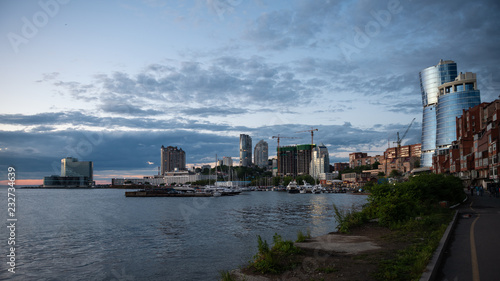 © Tatiana Gasich, Naklejka premium Panoramiczny krajobraz zatoki Amur. Krajobraz miasta Władywostok o zmierzchu. Miejski pejzaż