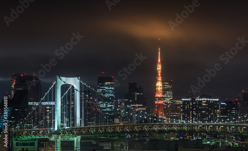 © Bob, Obraz premium Panoramiczny nowoczesny panoramę miasta z lotu ptaka na zatokę tokijską w deszczową noc