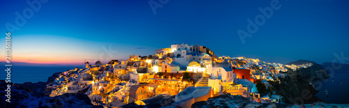 Naklejka premium Panoramiczny widok na miasto Oia przed wschodem słońca, wyspa Santorini, Grecja