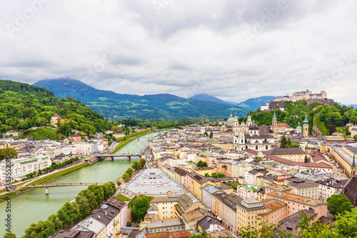 Naklejka premium Panoramiczny widok na stadt salzburg z rzeką salzach, deszczowy dzień, most, zamek i góry, austria