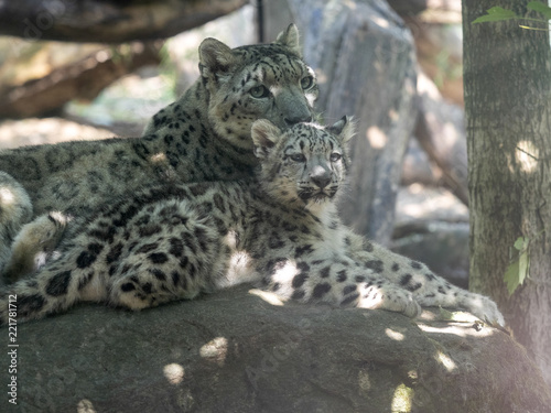 Obraz premium Pantera śnieżna, uncia uncia, samica z dzieckiem