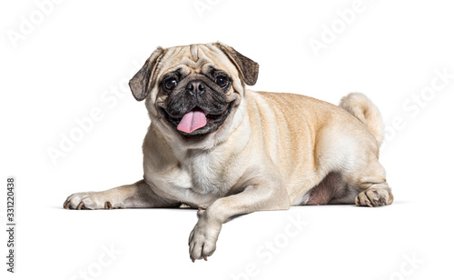 © Eric Isselée, Obraz premium Panting Pug lying down, isolated on white