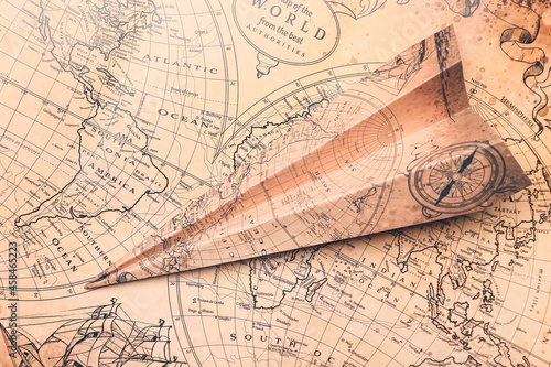 © Pixel-Shot, Obraz premium Paper airplane on vintage world map