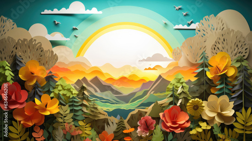 Fototapeta premium Paper Art Layered of colorful natural landscape view with sun mountain and sky