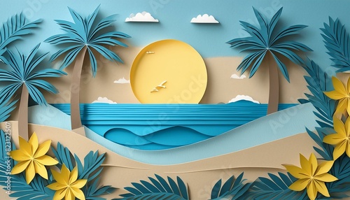 Obraz premium paper art of tropical beach with blue ocean, palm tree, sand and sun. Perfect for olakat, holiday banner
