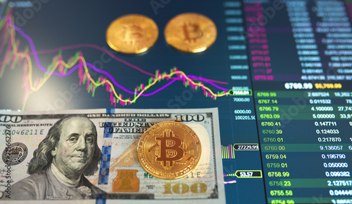 © byswat, Fototapeta premium Paper bill hundred Dollar, USD, blurred background. The electronic schedule of bitcoin on the exchange, volume trades, on the monitor lie gold coins bitcoin.