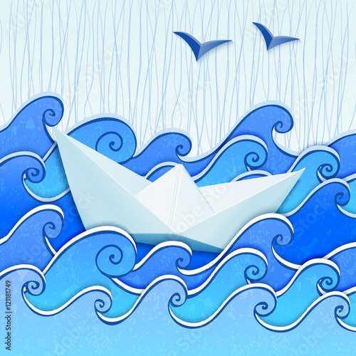 © art_of_sun, Naklejka premium Paper boat in the blue sketched sea