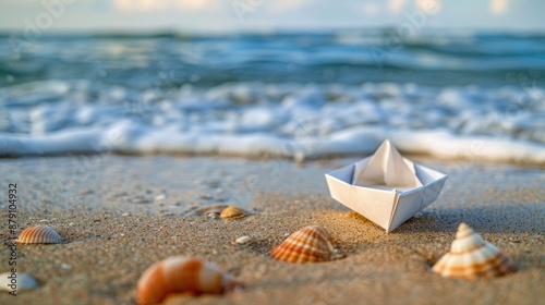 © The 2R Artificiality, Naklejka premium Paper boat on sandy beach with shells and stones sea waves in background Space for text Idea of travel