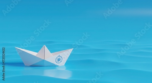 Obraz premium Paper Boat with Compass Navigating a Blue Sea