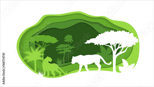 Obraz premium Paper Crafted Cutout World. Concept of tropical rainforest Jungle. Vector...