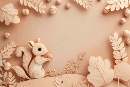 Fototapeta premium Paper Cut Art Scene with Squirrel and Acorns - Autumn Nature Design for...