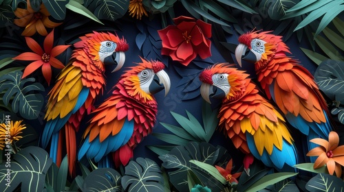 © Suradet Rakha, Fototapeta premium Paper cut birds in a tropical aviary zoo.