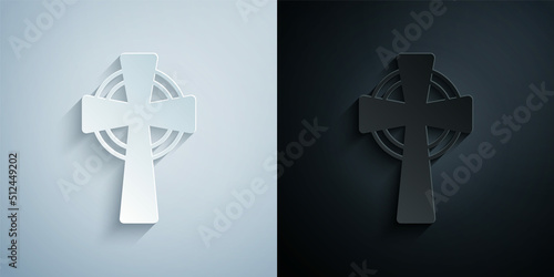 Obraz premium Paper cut Celtic cross icon isolated on grey and black background. Happy...
