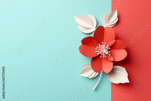 © Tommyview, Naklejka premium Paper cut flowers and leaves, Fresh spring nature background. Floral banner, poster, flyer template with copy space.