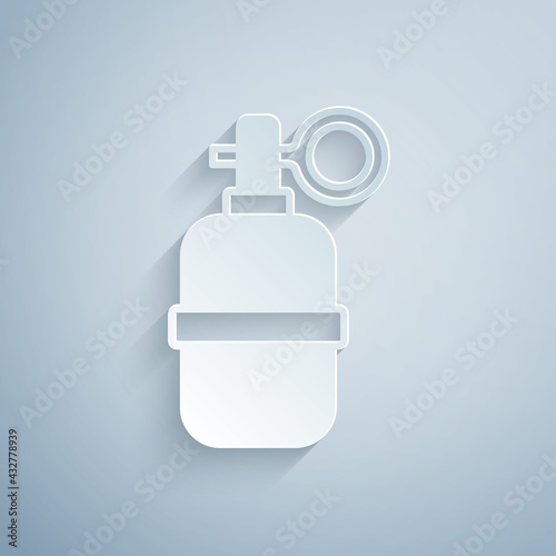 Obraz premium Paper cut Hand grenade icon isolated on grey background. Bomb explosion. Paper art style. Vector