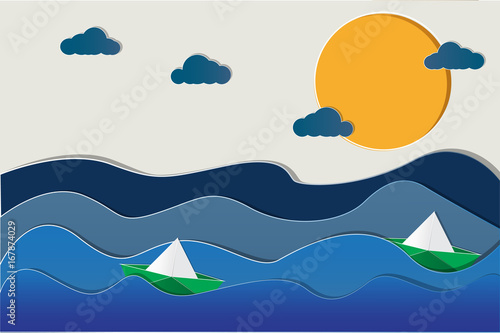 © boophuket, Naklejka premium Paper cut in summer ocean concept. In the ocean there are two ships are cruising through the waves at sunset in paper cut effect background ESP10.