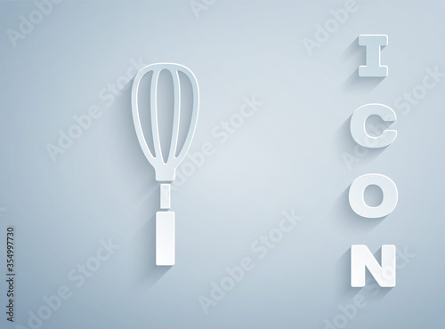 Fototapeta premium Paper cut Kitchen whisk icon isolated on grey background. Cooking utensil, egg beater. Cutlery sign. Food mix symbol. Paper art style. Vector Illustration
