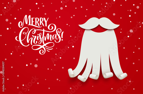 © Vector Tradition, Fototapeta premium Paper cut Santa beard and moustaches on Christmas card. Vector design includes Merry Christmas calligraphy with snowflake decorations for festive greetings, winter celebrations and holiday postcards