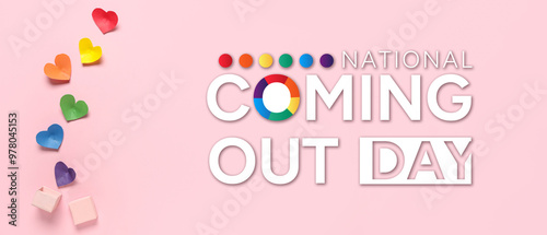 © Pixel-Shot, Fototapeta premium Paper hearts in colors of LGBT flag and gift box on pink background. Valentine's Day celebration