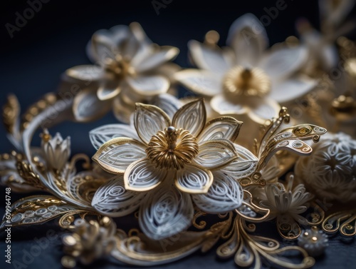 © Denis Darcraft, Fototapeta premium Paper made flowers Quilling craft technic white and gold abstract background lines Created with Generative AI technology