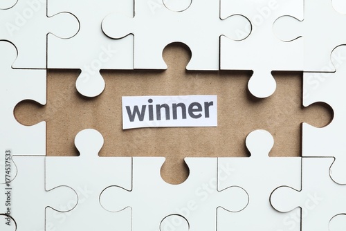© New Africa, Fototapeta premium Paper note with word Winner and jigsaw puzzle pieces on carton, top view