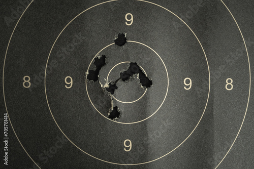© Dmitri, Naklejka premium Paper target with bullet holes in the center, close-up photo.