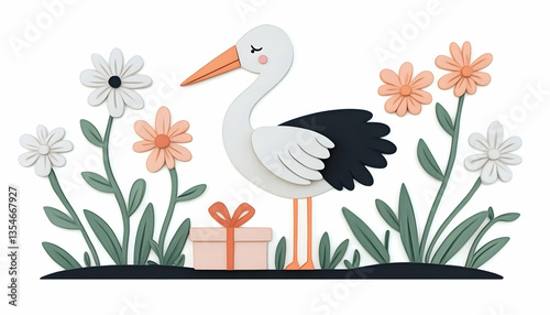 © Supriyono, Fototapeta premium Papercraft stork with gift amidst blooming flowers